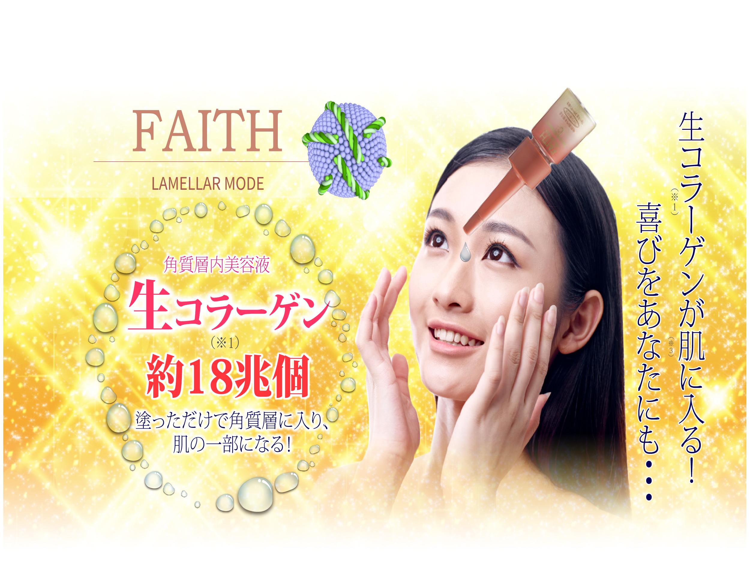 (※1)…うるおい成分:生体リン脂質(水添レシチン)、生コラーゲン(水溶性コラーゲン)、フィトステロールズ (※2)…世界で初めての化粧料基剤を使用(2015年11月株式会社ベンチマーク統計研究所調べ) (※3)…お肌=角質層(※4)…水分と脂質によって構成された角質層の構造 (※5)…加水分解コラーゲンと比べ1分子あたり(当社製品比較。なお、加水分解コラーゲンと比べた1gあたりは6倍) (※6)…うるおい成分:ヒアルロン酸Na (※7)…うるおい成分:加水分解エラスチン (※8)…うるおい成分:生体リン脂質(水添レシチン)、ゼラチンコラーゲン(水溶性コラーゲン)、加水分解コラーゲン、フィトステロールズ、β‐シトステロール硫酸Na (※9) 整肌成分:ビタミンC配糖体(アスコルビルグルコシド) (※10) 効能評価試験済み (※11)親水基・親油基とも石油起源の化合物から成る合成界面活性剤 (※12)エキス抽出エタノールを除く